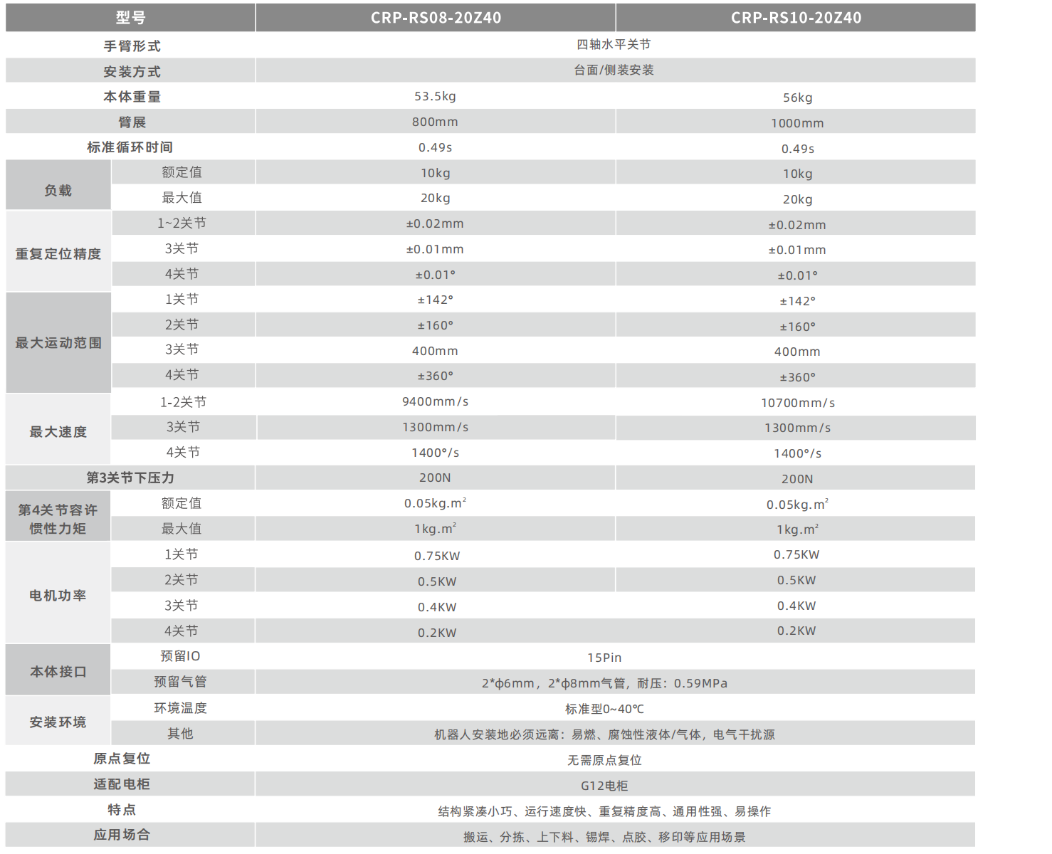 • 可提供800毫米臂长规格,最高有效负载可达20kg,额定有效负载为10kg。